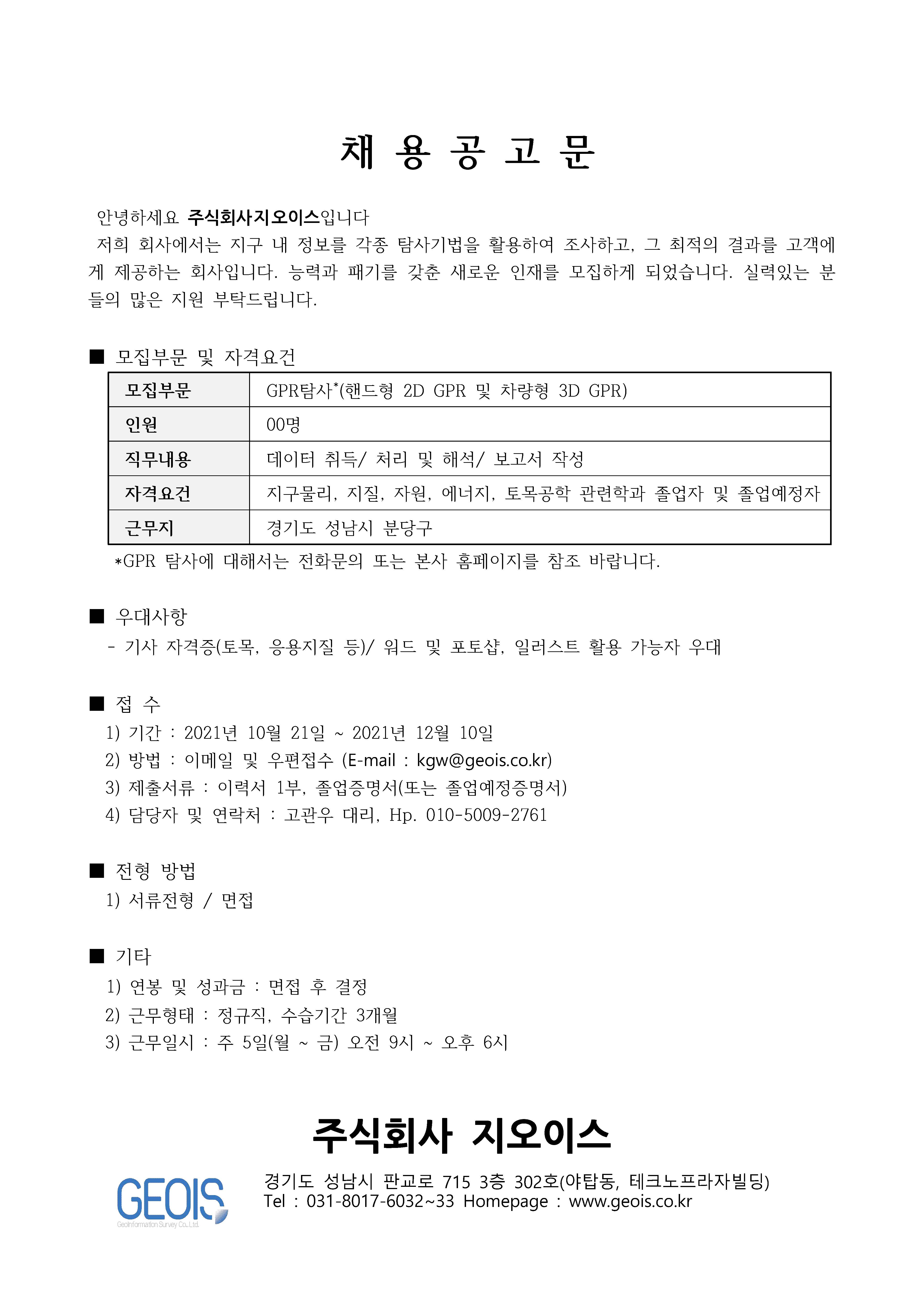 [채용] (주)지오이스 직원채용(지구물리, 탐사직)
