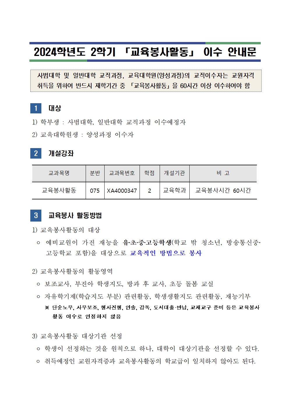 2025학년도 2학기 「교육봉사활동」 이수 안내문