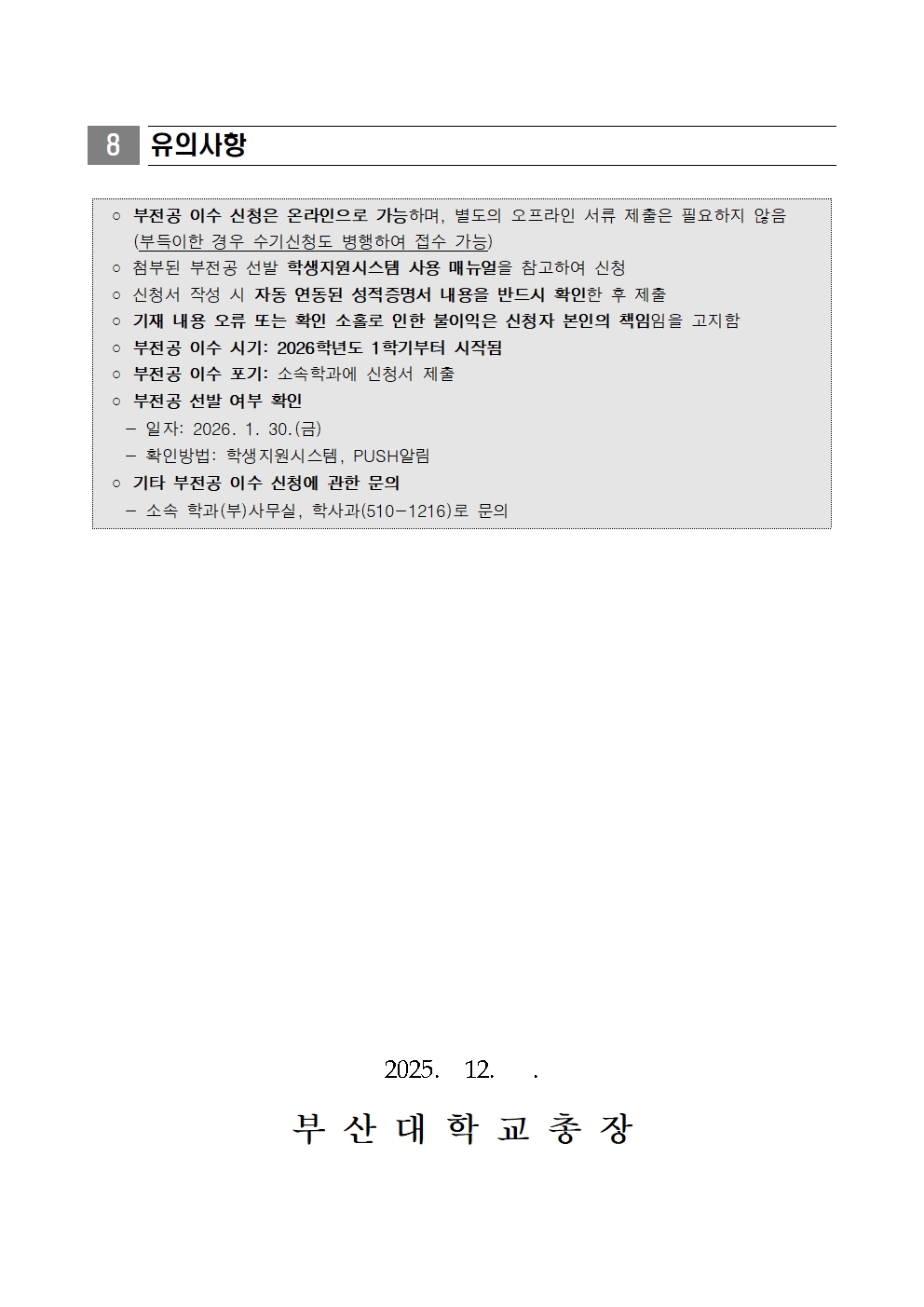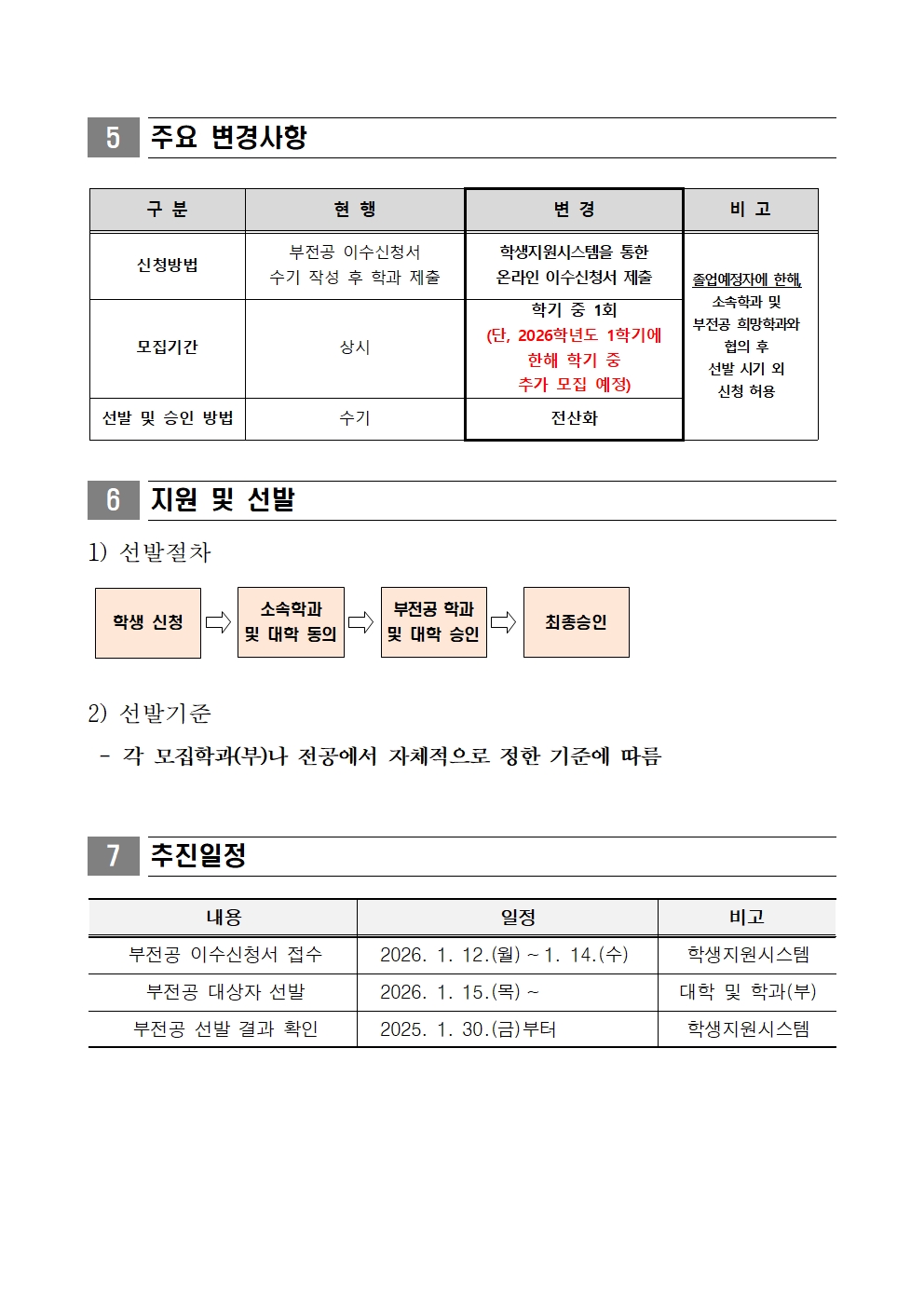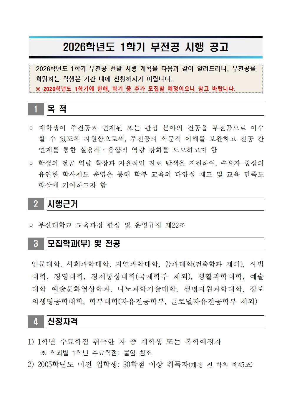 2026학년도 1학기 부전공 시행 공고(신청기간이 상시 → 학기중1회 신청기간 변경)