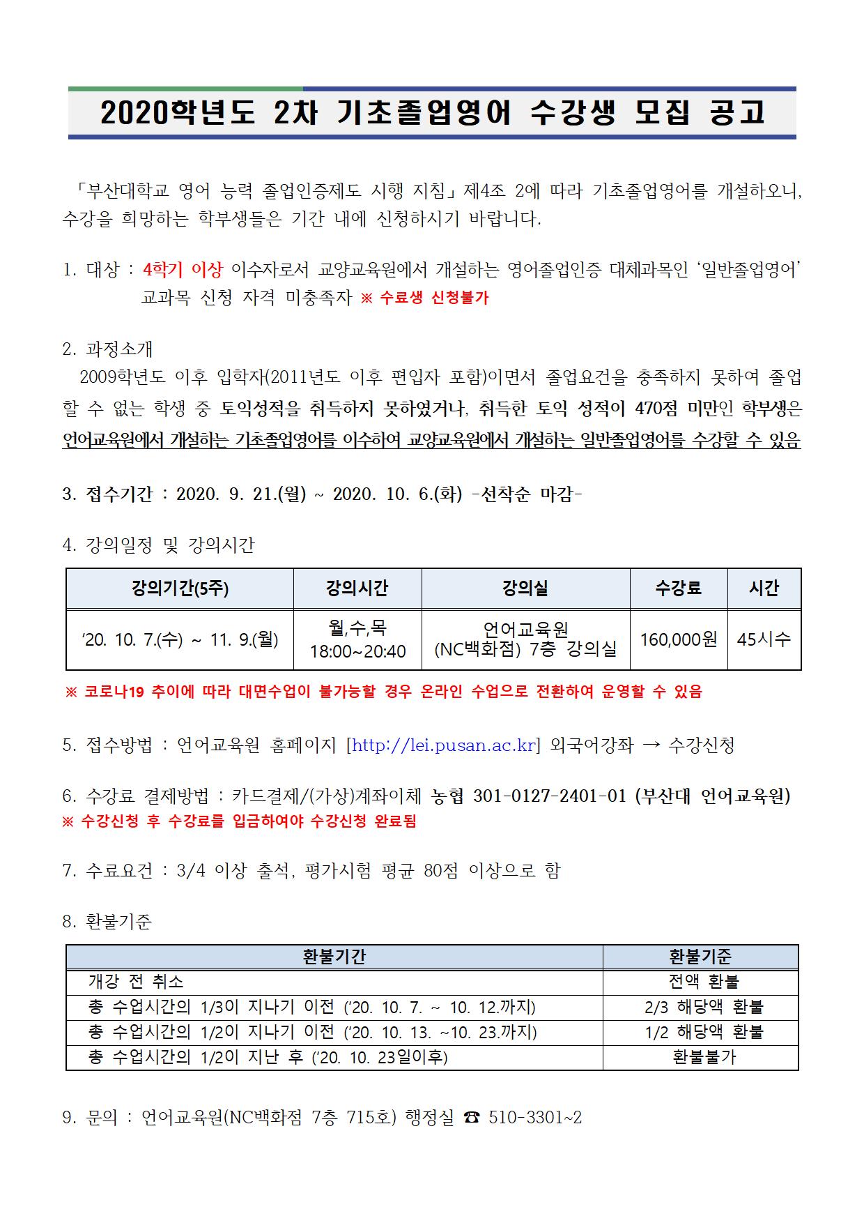 2020학년도 2차 기초졸업영어 수강생 모집 공고