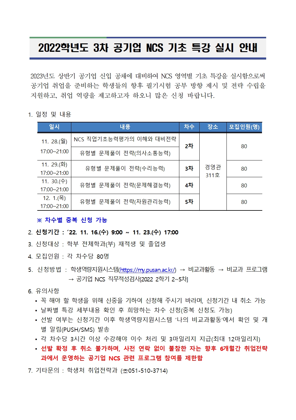 fnctId=bbs,fnctNo=2813 작성일 2022.11.14 수정일 2022.11.14 작성자 장주연 조회수 876 2022학년도 3차 공기업 NCS 기초 특강 실시 안내 첨부파일 첨부파일이(가) 없습니다.