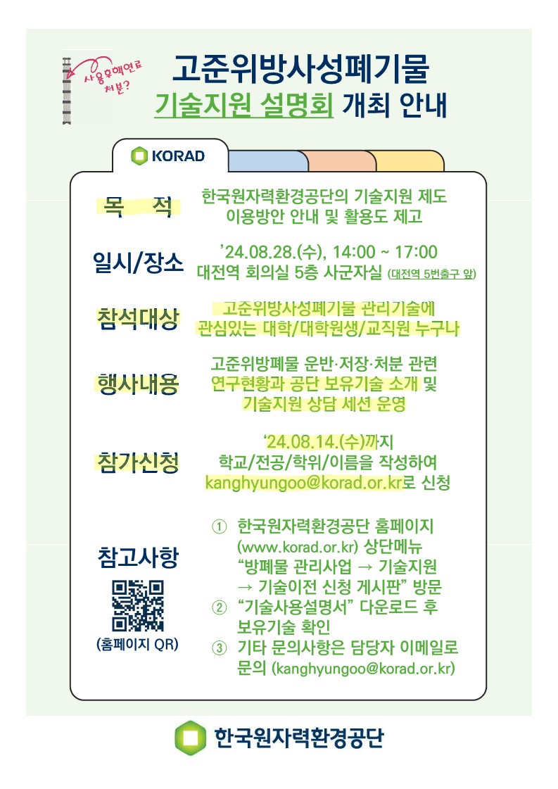 fnctId=bbs,fnctNo=2813 작성일 2024.08.02 수정일 2024.08.02 작성자 장주연 조회수 258 [KORAD:한국원자력환경공단] 고준위방폐물 기술지원 설명회 첨부파일 붙임 1. 고준위방폐물 기술지원 설명회 추진계획(안).pdf 미리보기