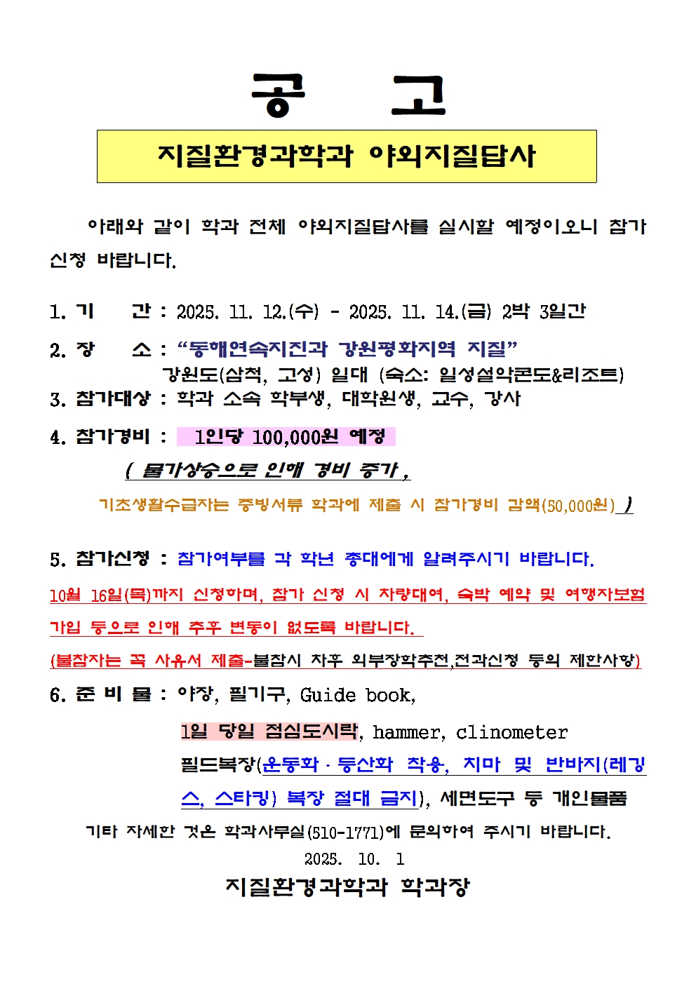 2025학년도 지질환경과학과 전체야외학술답사 일정 및 신청 안내